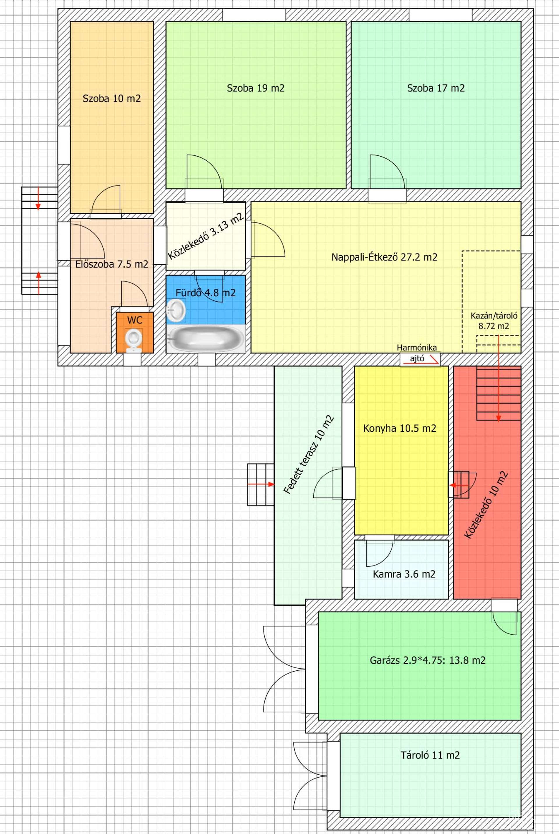 Jelenleg az épület 113 m2 lakrésszel, illetve továbbá 53 m2 egyéb épületekkel (garázs, tároló, ólak) rendelkezik.